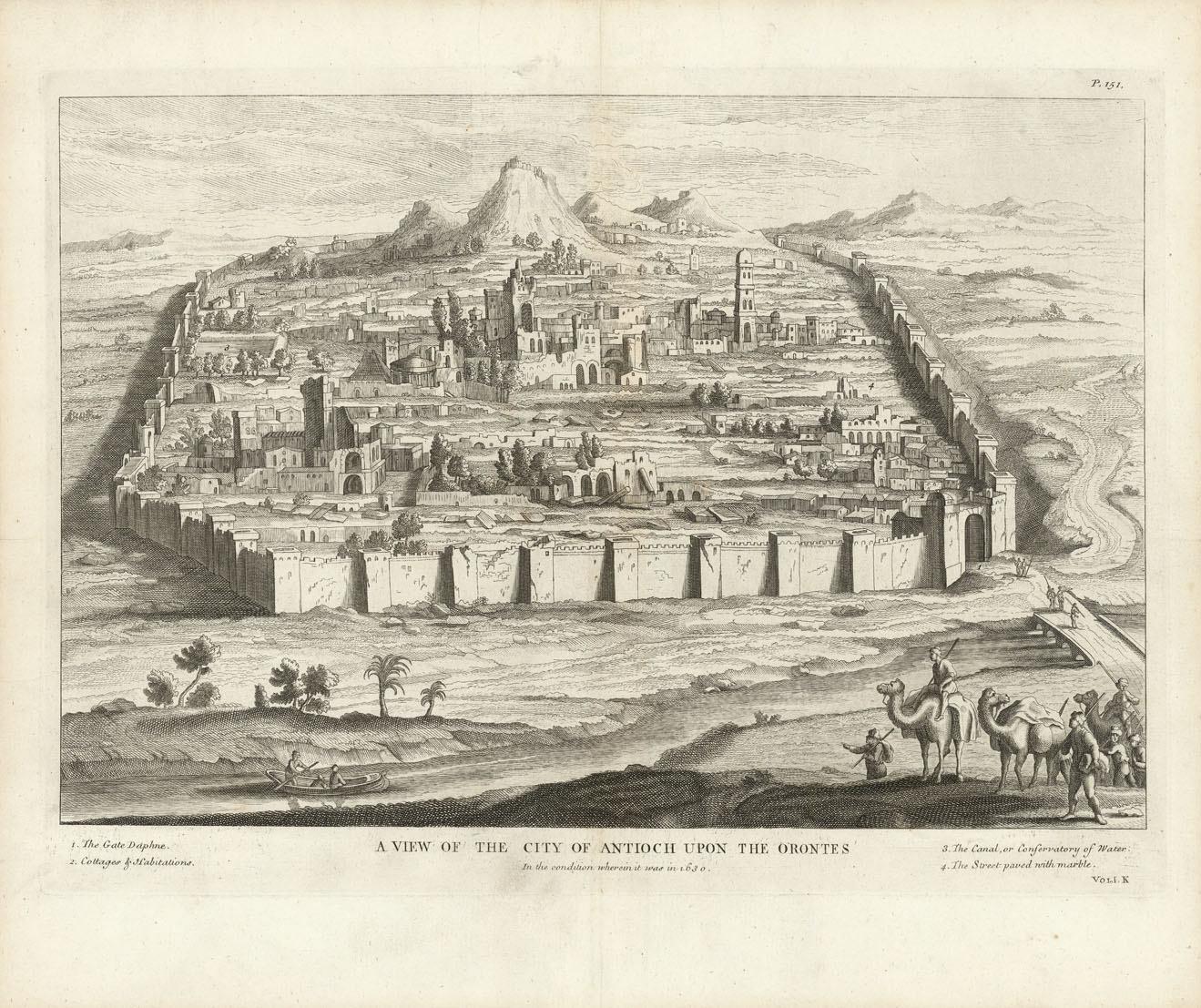 DESCRIPTION: A view of the ancient city of Antioch located on the Orontes river in southern Turkey. A numbered key identifies four locations.<br><br> Antoine Augustin Calmet, O.S.B. (1672-1757) was a French Benedictine monk and theologian. In 1720 he authored “Dictionnaire historique, critique, chronologique, geographique et litteral de la Bible” (Paris, two vols. folio). This work was translated into English and published in London.