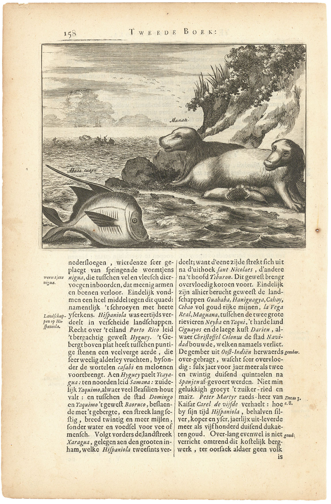 DESCRIPTION: This leaf from Montanus’ E Nieuwe en Onbekende Weereld offers a vivid account of marine life around Hispaniola, with particular attention to the manatee (manati) and the fish abacatuaia. Montanus describes the manatee as “niet ongelijk een ledere wijnsack” (“not unlike a leathern wineskin”), fifteen feet in length, with a gray, hairy hide, forelimbs beneath the head, and a narrowing tail. He recounts the story of a tamed manatee named Maton, kept in Lake Guaynaho by the cacique Caramatexi, so domesticated that it came when called, joined meals indoors, and even carried children across the water on its back. The fish abacatuaia is noted for its silvery ringed eyes, five black fins, forked tail, and thin, shining skin, with flesh said to be particularly tasty. Both text and illustration highlight the exotic richness of the Caribbean’s natural world, presenting creatures that were at once marvelous, useful, and strange to European readers encountering them for the first time.