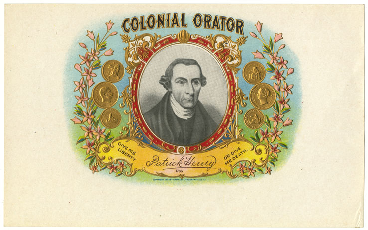 DESCRIPTION: A cigar box label honoring Patrick Henry (1736-1799), one of America's Founding Father. He became famous for his fiery speech at the Second Virginia Convention in 1775, in which he declared "Give me liberty, or give me death!" <br><br> Printed by the American lithographic Co. <br><br> A facsimile signature is printed below the portrait and "1765" is printed below it. The date might be a reference to the year Henry gained a seat in the Virginia House of Burgesses, following the resignation of William Johnson. It could also be a reference to the 1765 Stamp Act, in which the British Parliament implement taxes upon printed material in the colonies. The newly appointed Henry became famous for his passionate opposition of the Act and he proposed his resolutions on May 30, 1765, only about 10 days after he was sworn into the House of Burgesses. The final result of his response were the Virginia Resolves, a series of resolutions in which the colony of Virginia declared that Parliament could not tax the citizen of Virginia, only governmental bodies in which Virginians themselves elected representatives had such authority.