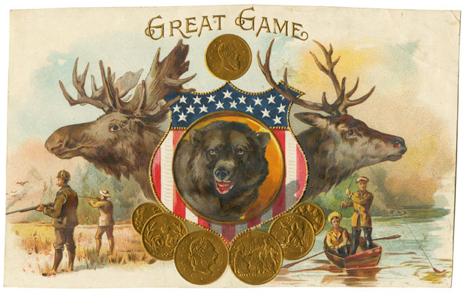 DESCRIPTION: A cigar box label depicting hunting and fishing scenes. A bear, moose and elk make up the central decoration.