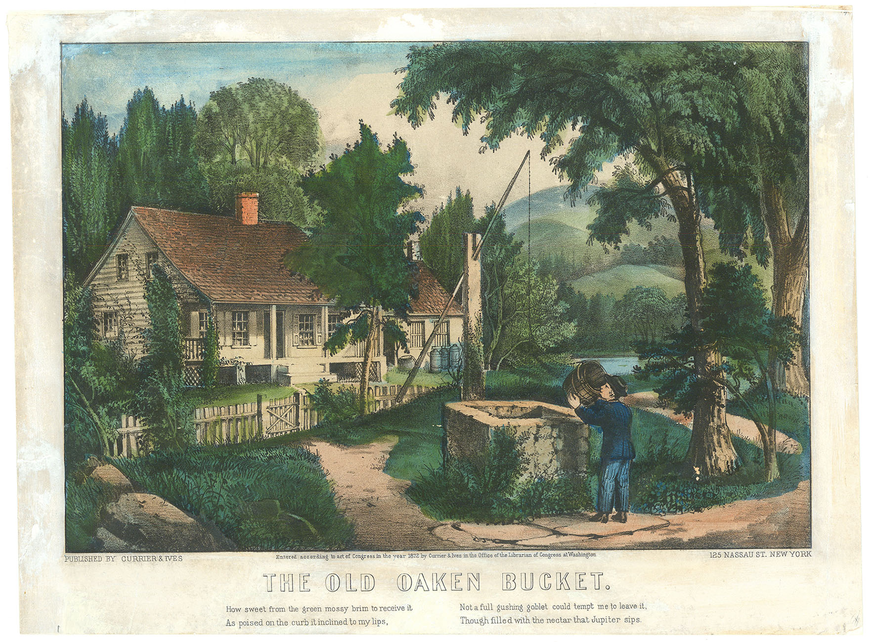 DESCRIPTION: This lithograph was inspired by Samuel Woodworth's famous poem "The Old Oaken Bucket." Originally written in 1817, it became a raging hit after composer George Kiallmark set the poem to music in 1826. Generations of Americans sang the tune and in 1899, the Haydn Quartet, one of the most famous barbershop quartets of their day, recorded their version of it to be played on the Berliner Gramophone. <br><br> Four lines of poem read, "How sweet from the green mossy brim to receive it, As poised on the curb it inclined to my lips, Not a full gushing goblet could tempt me to leave it, Though filled with the nectar that Jupiter sips."