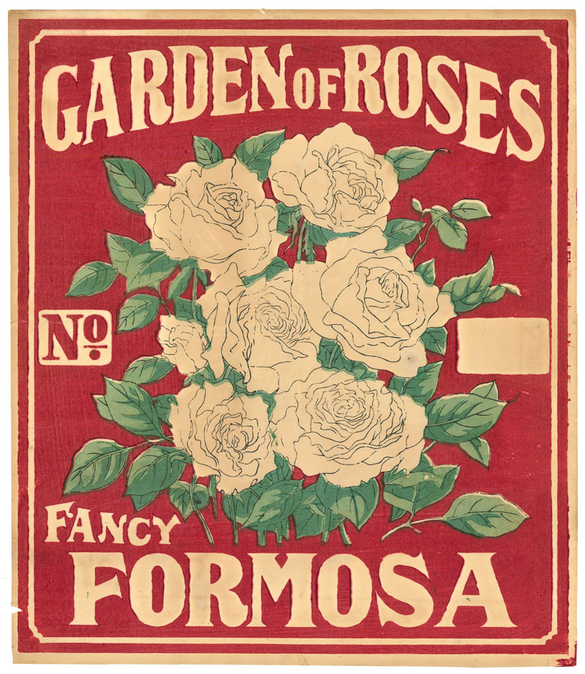 DESCRIPTION: A highly decorative advertising label for Formosan tea.<br><br> Taiwan (aka Formosa) began to cultivate tea for commercial purposes during the mid 19th century. These colorful labels were produced to be applied to the sides of boxes of tea meant to be shipped to the U.S. and European markets.<br><br> These labels are printed on thin rice paper and an ink that is highly susceptible to water. Once applied to a box, that was it. The print is extremely fragile which likely explains their rarity. <br><br>