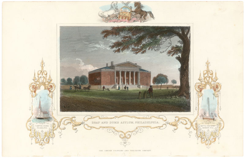 DESCRIPTION: Surrounding the primary image and three smaller ones. At the top are two horses. A banner at their hoofs reads "Virtue, Liberty & Independence." At the bottom are views of the "Floating Church, Philadelphia" and "Battle Monument Bunkers Hill."