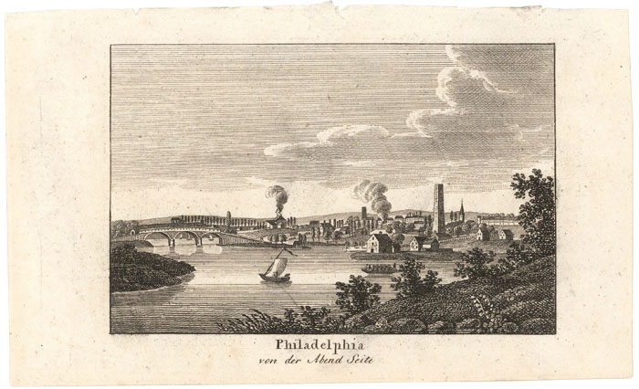 DESCRIPTION: A charming early view of Philadelphia, Pennsylvania from "Eberhard August Wilhelm von Zimmermanns Taschenbuch der Reisen", a twelve-volume series published between 1802-1813 which described and illustrated the author's worldly travels. <br><br> A shot tower can be been on the right. These structures were used to produced "shots" or round balls used in firearms of the day and other applications utilizing small lead balls.