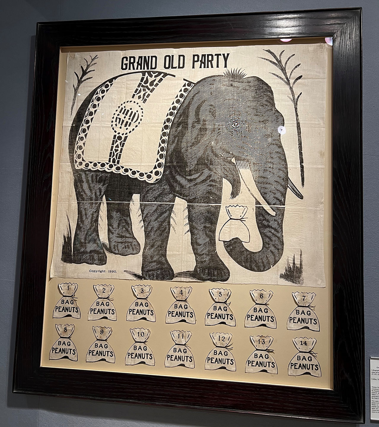 DESCRIPTION: No publisher or printer's name is given, just "copyright, 1890.<br><br> Likely the Earliest Depiction of the G.O.P. Mascot Elephant on Fabric!<br><br> Thomas Nast’s 1874 cartoon "Third Term Panic" is widely considered with first popularizing the elephant as a symbol for the Republican Party. While the elephant is found on earlier political ephemera (one 1860 Abraham Lincoln campaign ribbon is adorned with an elephant), the formal tie of the pachyderm as the Republican Party emblem dates to Nast and the Grant Administration.<br><br> This 1890 textile, glazed muslin, is the earliest known fabric presenting the G.O.P elephant. Cataloged by Herbert Collins as Threads #680 (Threads of History, Smithsonian Institution Press, 1979, p. 285), that example is part of the Smithsonian’s permanent collection.<br><br> Two years before this textile was made, a humorous game to secure G.O.P. support, the Democratic Party lost the White House to Republican Benjamin Harrison. He defeated a popular president, Grover Cleveland, whom he would face again two years later in the election of 1892. In the third contest between these two Standard Bearers, Cleveland would return to office with a sizable majority.<br><br> Scarce