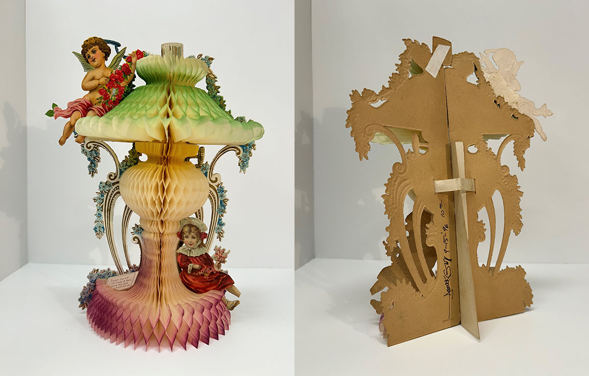 CONDITION: Overall good condition. The girl in the lower right is missing her left foot. Upper, card segment of the lamp fortified / stiffened on the back to prevent loss. Ink notations from prior owner on the back.