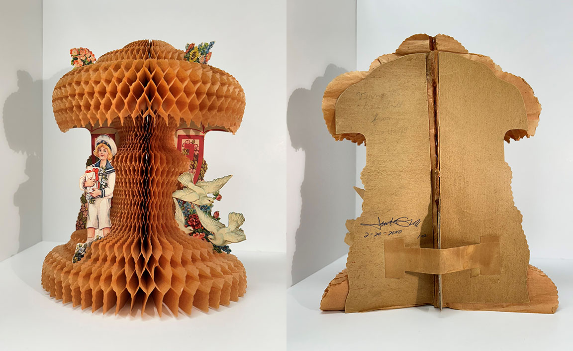 DESCRIPTION: A large 3D Valentine with red honeycomb forming a lamp, and an easel back. Added segments include a boy with an armful of flowers and love letters, doves and flowers.