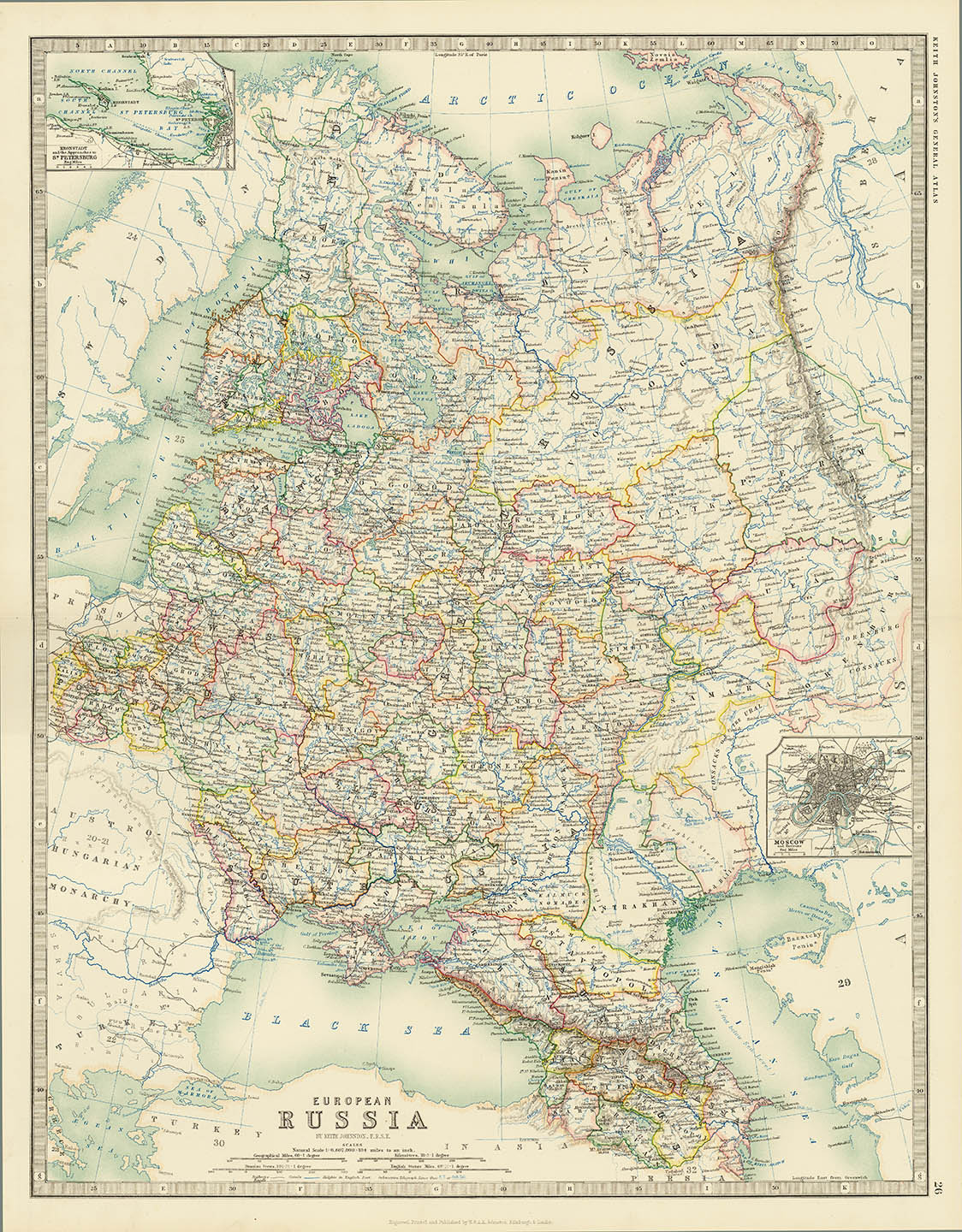 DESCRIPTION: A very detailed map of the region. Inset map shows Moscow. This map appeared in Johnston's "The Royal Atlas of Modern Geography." Retains a index sheet of names and locations.