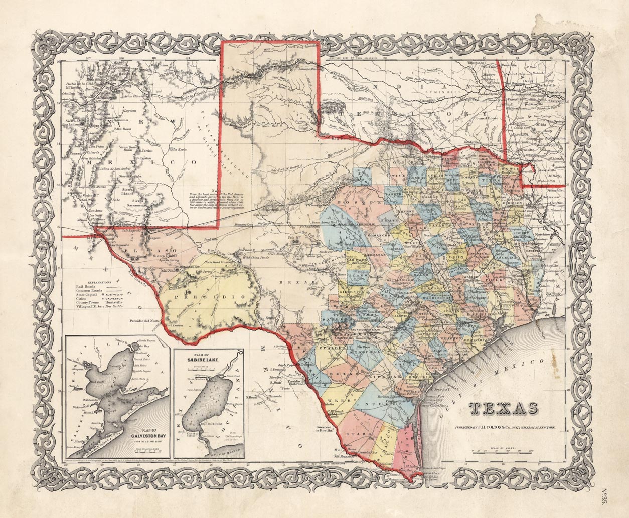 DESCRIPTION: In 1855, much of Texas was undeveloped. This map shows the Panhandle as being occupied by the Kiowa (Northern Comanches) and the west inhabited by Lepans and Southern Comanches. The Pacific Railroad link, between Fort Belknap and El Paso, is only a proposed route here. The insets show the "Plan of Galveston Bay and the "Plan of Sabine Lake". Many other interesting details. Plate 35 from Colton's "Atlas of the World".