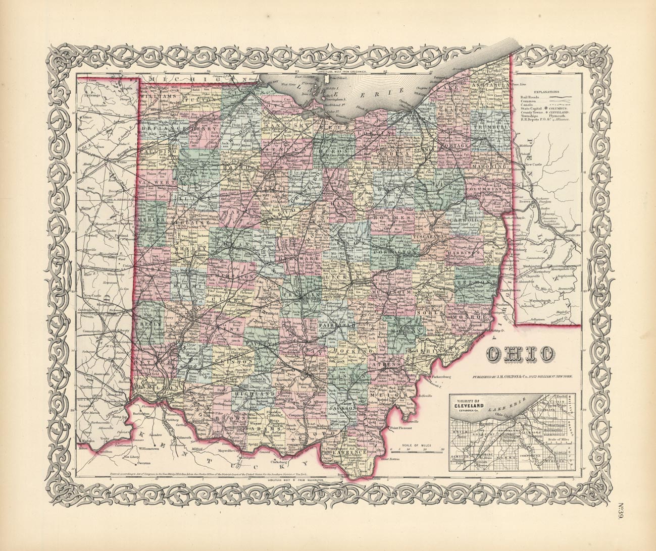 DESCRIPTION: A decorative and well engraved map from "Colton's Atlas of the World." Inset of the "Vicinity of Cleveland, Cuyahoga Co." A nice bright impression.
