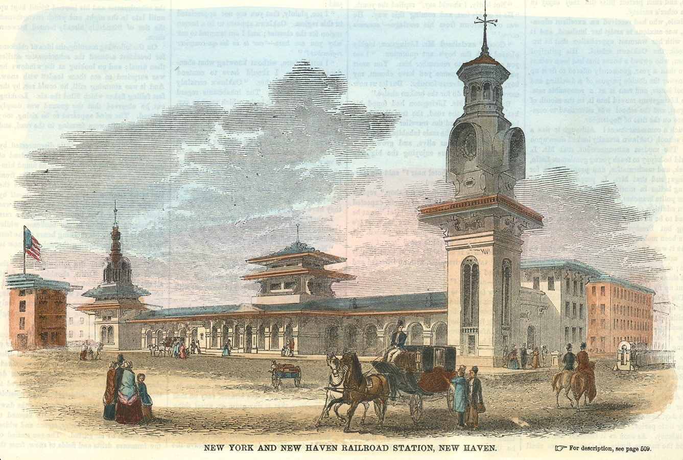 DESCRIPTION: A 19th-century perspective of New York and New Haven Railroad Station, New Haven Connecticut, captured as a wood engraving and hand colored to highlight the details.