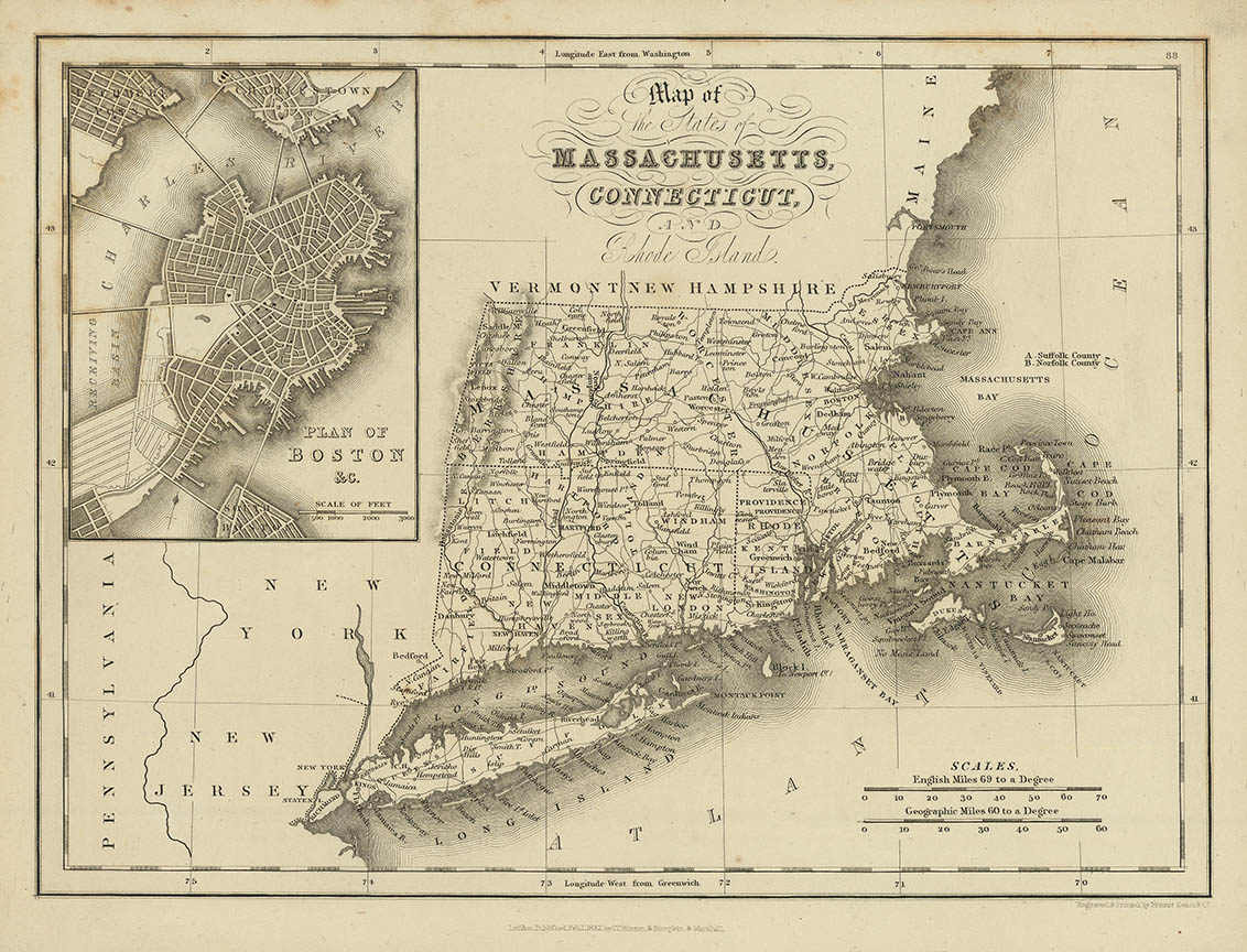DESCRIPTION: Engraved by Fenner Sears & Co. With an inset "Plan of Boston &c." at upper left.<br><br> Long Island is delineated as well.<br><br> A very well engraved map.