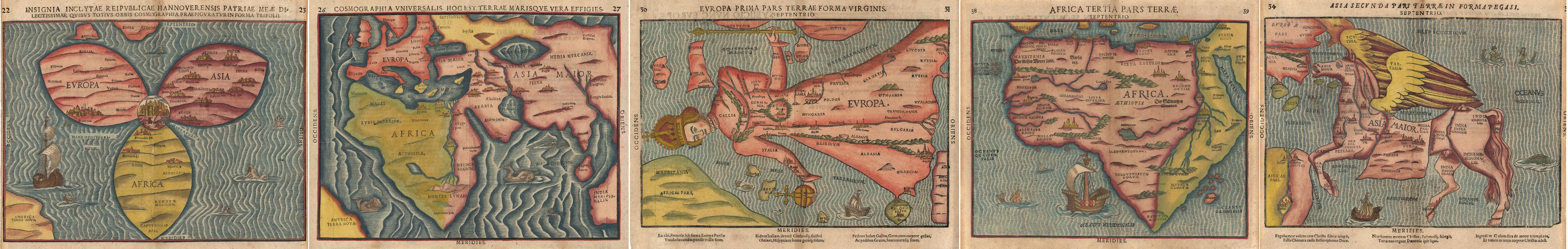 DESCRIPTION: A fine set of Bunting maps including the cloverleaf world map, another world map, Asia in the form of Pegasus, Africa, and Europe in the form of a virgin. Both world maps depict a small corner of the New World in the lower left labeled "America terra nova." The Cosmographia Universalis map also shows a fragment of a southern continent denominated "India meridionales."<br><br> Heinrich Bunting was a theological commentator from Hanover, Germany. He first published his "Itinerarium Sacrae Scriptura" in 1581. The work is famous among collectors as one of the great compilations of thematic maps including Europe as a Queen and Asia as Pegasus. <br><br> Shirley notes that Buenting's Itinerarium . . . "was reprinted at least 10 times in several languages" over the next 70 years and "at least two further sets of [wood] blocks were produced, in addition to normal variations in type occurring. . . "<br><br> A scarce and very attractive set.
