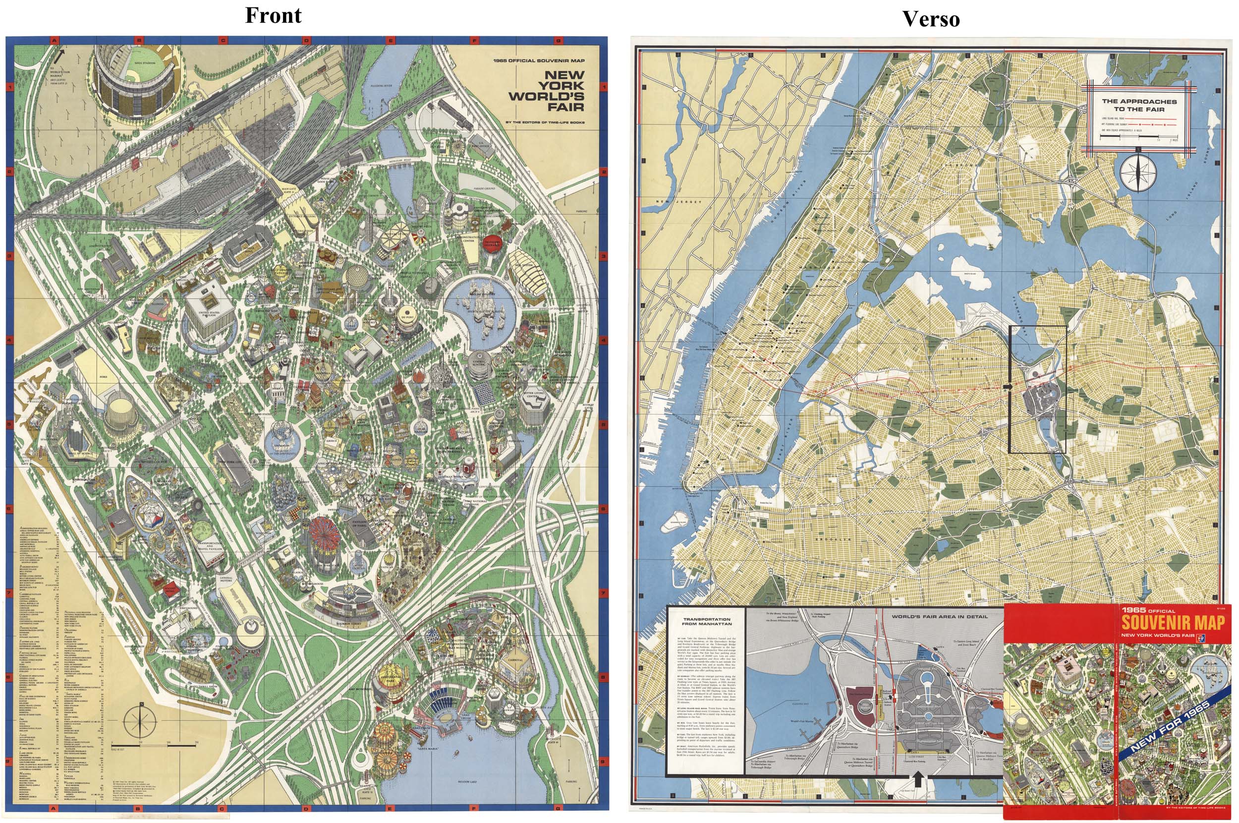 DESCRIPTION: A highly decorative official guide map showing the grounds of the 1965-66 World Fair in Flushing, Queens. A key identifies the many exhibits, rides, etc. In the upper left is Shea Stadium., late home of the New York Mets. On the verso is a map of the surrounding region. .<br><br> Hermann Bollmann (1911-1971) was a German cartographer who brought his training as a graphic artist to bear on the German tradition of Vogelschaukarten or bird's-eye-views.