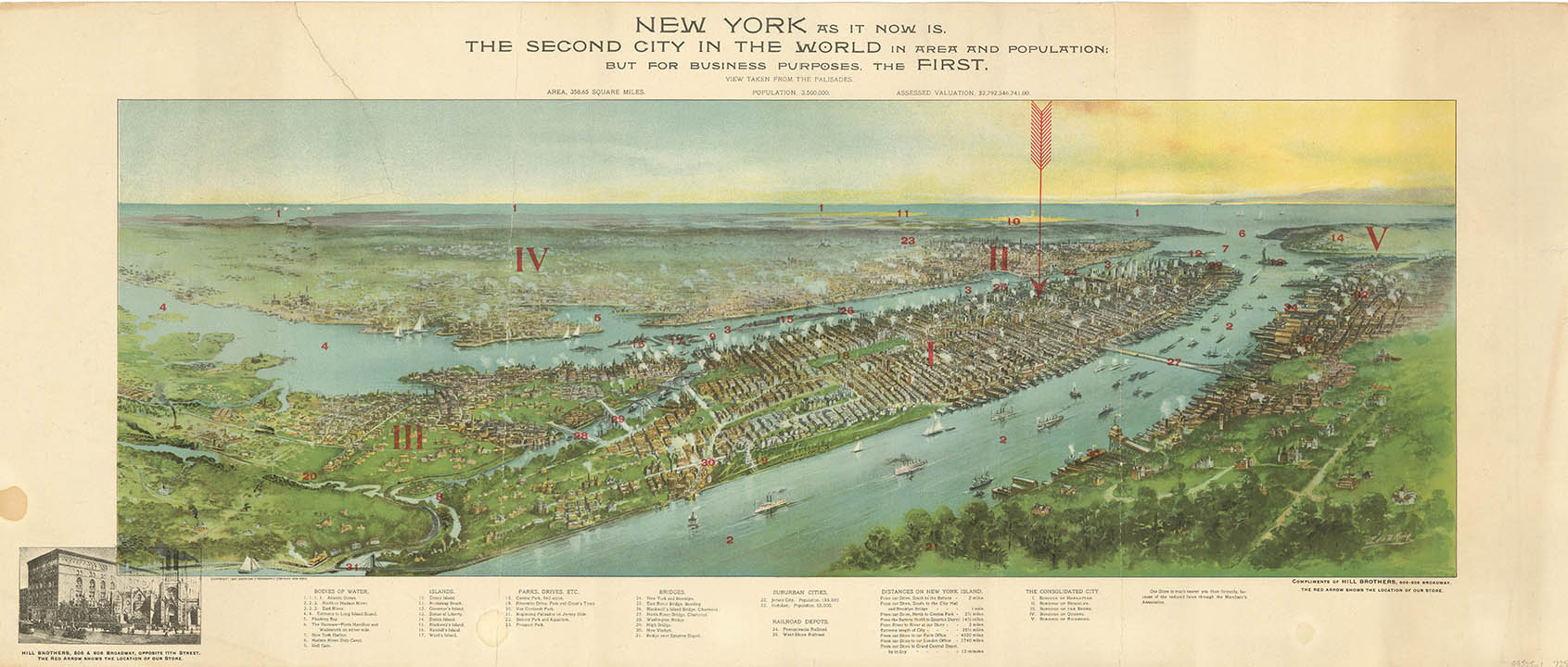 DESCRIPTION: An unusual perspective of Manhattan and close surrounding areas. <br><br> This view was printed by the American Lithograph Company and was overprinted for use by the Hill Brothers company, who were dealers in hats. bonnets and turbans. A red arrow points to their store on Broadway.<br><br> A numbered key identifies bodies of water, Islands, Parks & drives, Bridges (including the never built "North River Bridge", Railroad depots, distances etc. Signed l.r. in the plate, Edw. H. King.