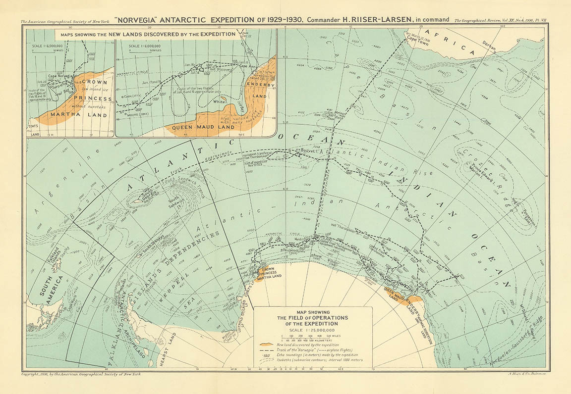 DESCRIPTION: Leader's narrative of Norwegian Antarctic Expedition 1929-1930 outlining route and oceanographic and meteorologic observations. Map shows discoveries and field operations.