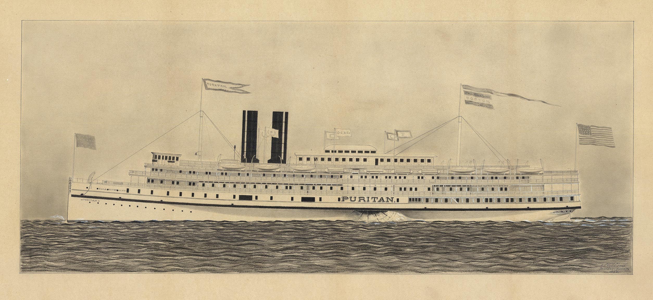 DESCRIPTION: Signed lower left "Drawn by C. F. Kenneston, Booth Bay Harbor, Me, 1897."<br><br> A beautifully rendered drawing of the Fall River Line steamship Puritan. The Fall River Line was the best known and longest running steamship lines that ran between New York and Fall River with connection to Boston. The line ran a number of ships of which the Puritan was one of the most famous.<br><br> The Puritan was designed by George Pierce and built in 1888 in Chester, PA. She operated on Long Island Sound between New York and Fall River It was withdrawn from service in 1912, and was scrapped in 1916.