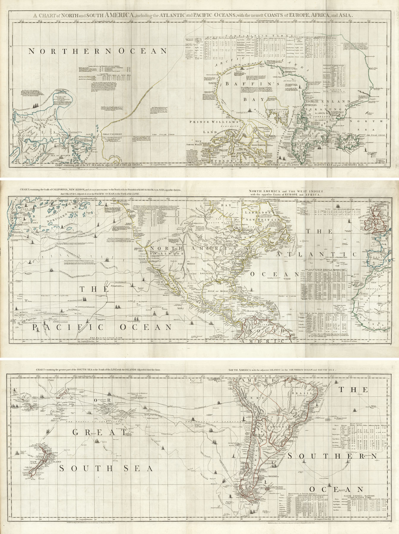 DESCRIPTION: Plates 1, 2, and 3 (originally six sheets joined together to make these three plates) appeared in Thomas Jefferys' "The American Atlas: or A Geographical Description of the Whole Continent of America..." The map, when joined together, centers on Great Britain's American colonies and extends to include the unexplored northern reaches of Canada, Greenland and Iceland, northeastern Russia, western Europe and Africa, "New Zeeland," and the whole of South America. Scattered throughout all plates are charts denoting explorers, exploration dates, cartographers, and geographical coordinates. Also shown on the map are the routes of several explorers and short descriptions of their journeys. A fun map to study.
