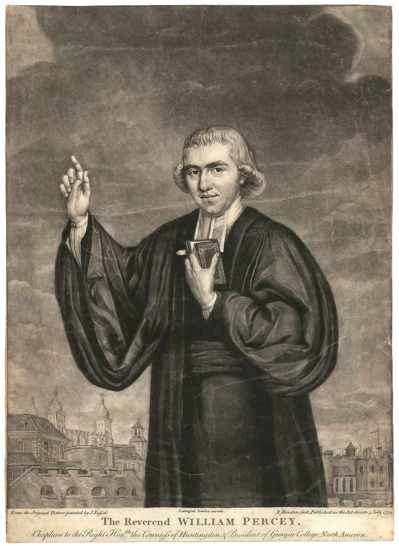 DESCRIPTION: This mezzotint, created by Richard Houston in 1774 after a painting by John Russell, depicts Reverend William Piercy (also spelled Percey) in a dignified three-quarter length portrait. Piercy, a notable figure as Chaplain to the Countess of Huntingdon and President of Georgia College in North America, is shown with one arm raised, holding a Bible, symbolizing his religious role. Behind him, a dramatic backdrop of clouds and city rooftops adds depth and context to the scene. <br><br> The piece was published in London by Carington Bowles, a prominent publisher trained by his father, John Bowles. Carington inherited the family business and later operated independently, contributing significantly to 18th-century English print publishing. The piece, printed on laid paper, reflects both Piercy’s esteemed position and the skillful craftsmanship of its creators, Russell and Houston.