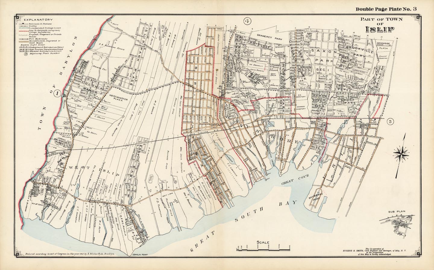 DESCRIPTION: This map shows an area from the border of Babylon to Bayshore in the town of Islip. Property lines, outline of homes and landowners names are given. This map is from "Atlas of a part of Suffolk County, Long Island…."