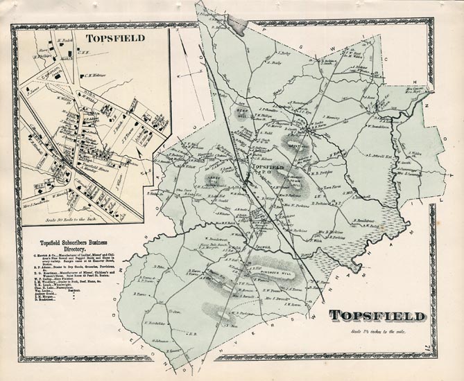 DESCRIPTION: A fine map from Beers' "Atlas of Essex County Massachusetts." Engraved by Worley & Bracher. Printed by Fred Bourquin. With inset map of a mid Topsfield. On the left hand side is a small list of old businesses.