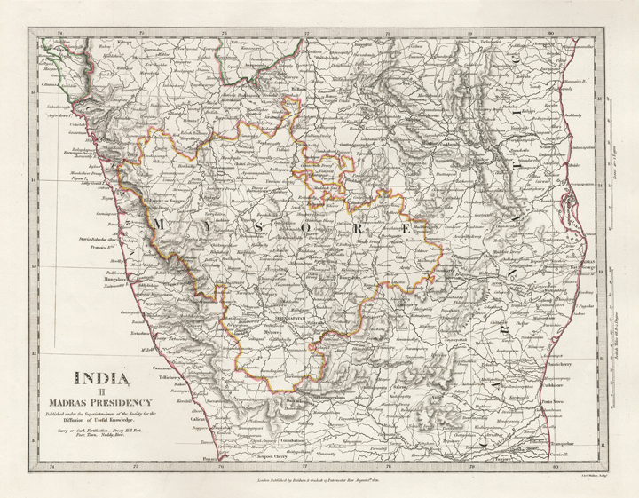 DESCRIPTION: The Madras Presidency, a-k-a Presidency of Fort St. George, a-k-a Madras Province, was an administrative subdivision (presidency) of British India. The Society for the Diffusion of Useful Knowledge, better known as SDUK, was an English enterprise devoted to spreading the most up to date cartographic information and enhancing geographical understanding and knowledge of the world. Over a period of years, the maps that the SDUK produced were issued by various publishers. The following is a breakdown. Baldwin & Craddock, 1829-32. Chapman & Hall, 1844. C. Knight, 1844-52. G. Cox, 1852-3. Stanford, 1857-70. The maps from this series are known for their fine engraving and attention to detail.