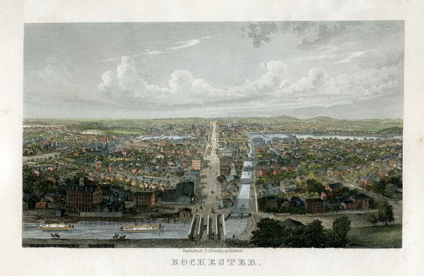 DESCRIPTION: Bird's eye view of Rochester, showing the river meandering through.