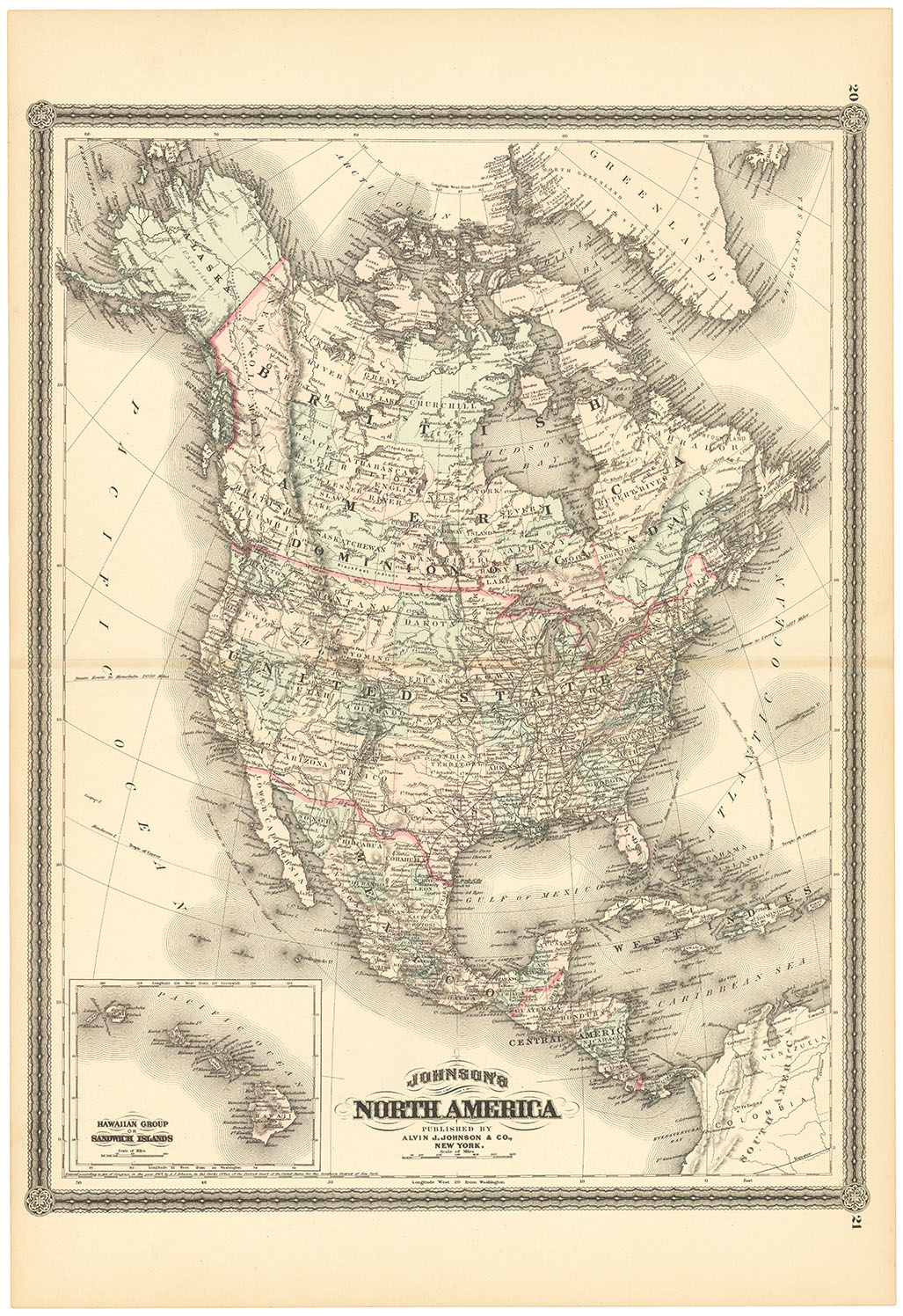 DESCRIPTION: Map from Johnson's New Illustrated Family Atlas of the World. First published in 1867, this particular impression dates to 1883. The map presents North America in rich detail and vibrant original color, surrounded by a finely engraved calligraphic border. An inset at lower left features the Hawaiian Islands, referred to at the time as the Sandwich Islands. A bright, clean impression from one of the most visually distinctive American atlases of the 19th century.