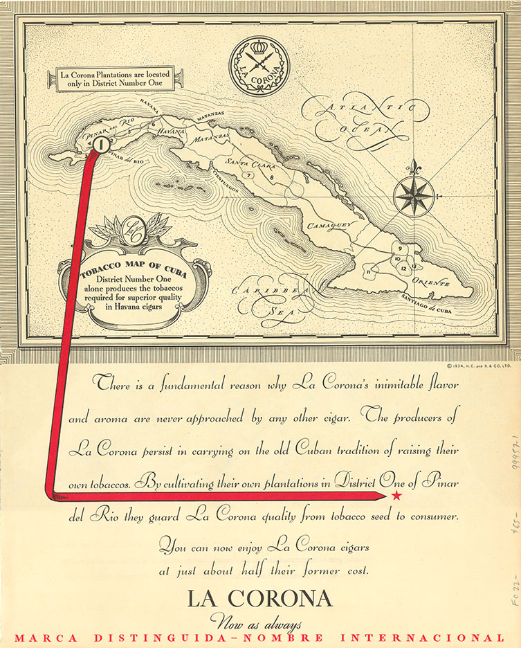DESCRIPTION: This map, "Tobacco Map of Cuba" by La Corona Cigars, was published in the May 1934 issue of Fortune magazine. Created during the golden age of Cuban tobacco, this vibrant map highlights the key growing regions and rich heritage of Cuban cigar production, promoting the now-discontinued La Corona brand—once a hallmark of pre-revolution Habanos SA. Both a marketing piece and a cultural snapshot, it combines visual flair with historical relevance, making it an appealing acquisition for collectors of vintage advertising, Cuban memorabilia, or tobacco history.