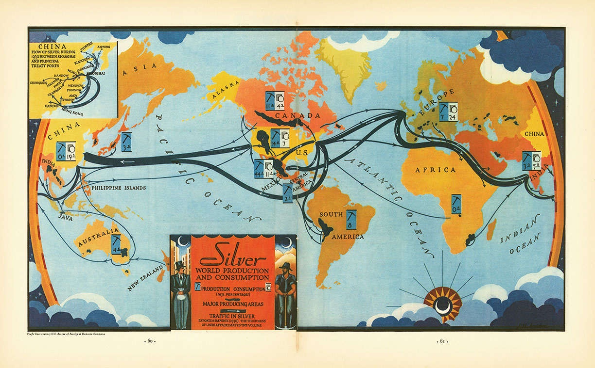 DESCRIPTION: An intricate and visually appealing map that illustrates the global regions of silver mining and consumption as of 1932. This map was featured in the July 1933 edition of Fortune magazine.