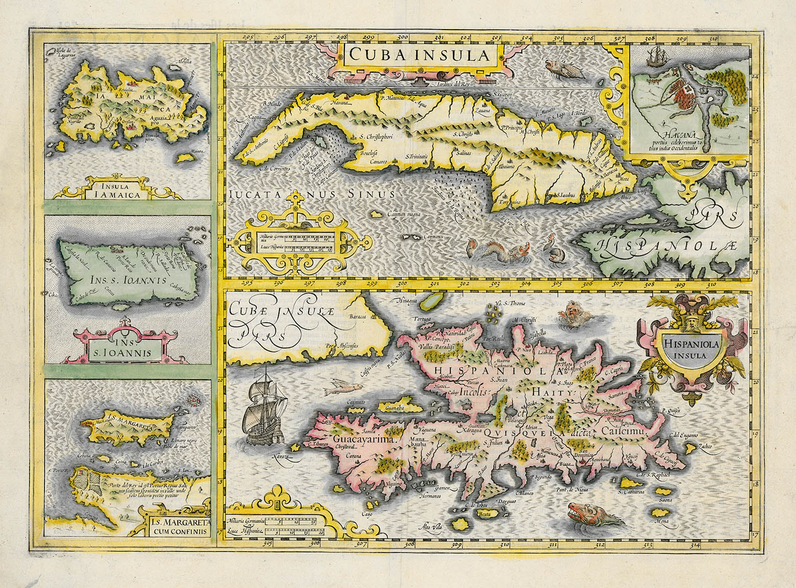 DESCRIPTION: A French text edition of the Mercator-Hondius composite map of five West Indian islands. They are Cuba (with inset map of Havannah), Hispaniola, Jamaica, Pureto Rico (titled Ins. S. Joannis), and Margarita. The map is richly embellished with sea monsters and sailing ships.