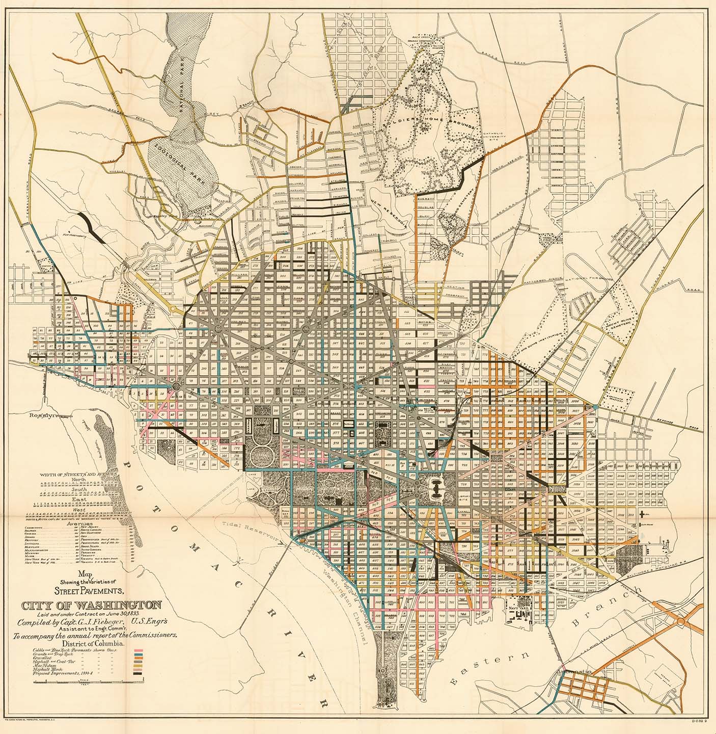 DESCRIPTION: An interesting map of Washington D.C. showing the extent and type of roadway pavements in the city at the end of the 19th century.<br><br> A key identifies the following: Pink, Cobble and Blue Rock; Blue, Granite and trap rock; Orange, Gravelled; Brown, Asphalt and Coal Tar, etc.<br><br> A fun map to study.