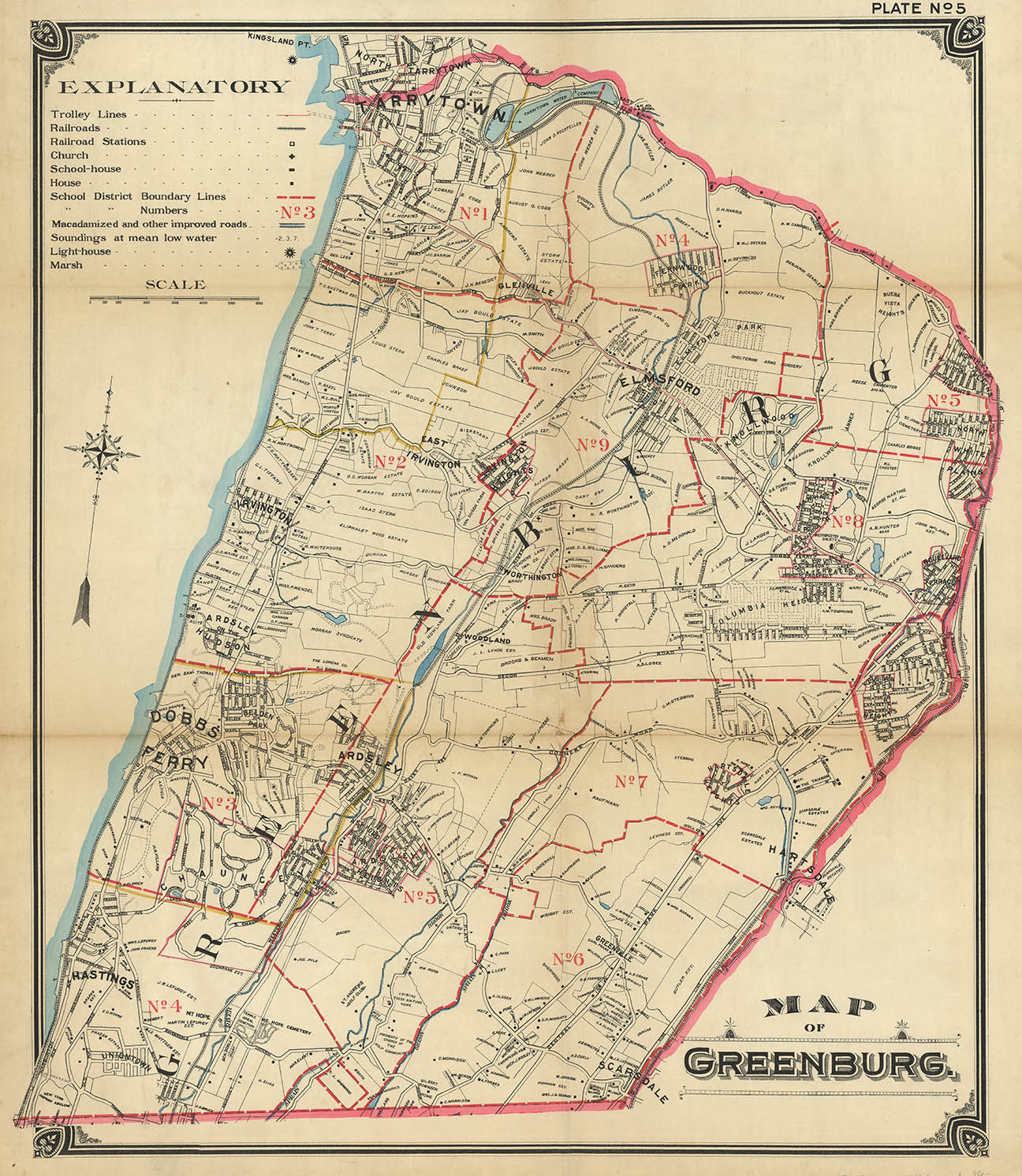 DESCRIPTION: A detailed large scale map of these towns.. Key identifies railroad lines, stations, trolleys, school districts etc. Larger land owners names noted.<br><br> Identifies all the small towns in the area including Scarsdale, Hartsdale, Elmsford, Hastings, Dobbs Ferry, Ardsley, Irvington etc.