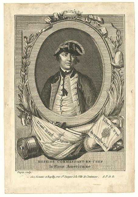 DESCRIPTION: In 1775, Commodore Esek Hopkins was appointed Commander-in-Chief of the newly-formed Continental Navy. Despite his earnest efforts, however, the navy failed to meet the expectations of Congress. Hopkins had to compete with privateers for supplies and, more importantly, for men; privateers offered sailors higher wages and a greater share of plundered goods. By January 2, 1778, Congress wearied of Hopkins' meager accomplishments and dismissed him from his position as Commander-in-Chief.<br><br> Surrounding the portrait are ribbons, laurel, a liberty cap, a cannon and two flags, one with a rattle snake with the quote D'ont tread upon me, and the other, Liberty Tree, an appeal to God. Both are early depictions of classic Revolutionary flags.