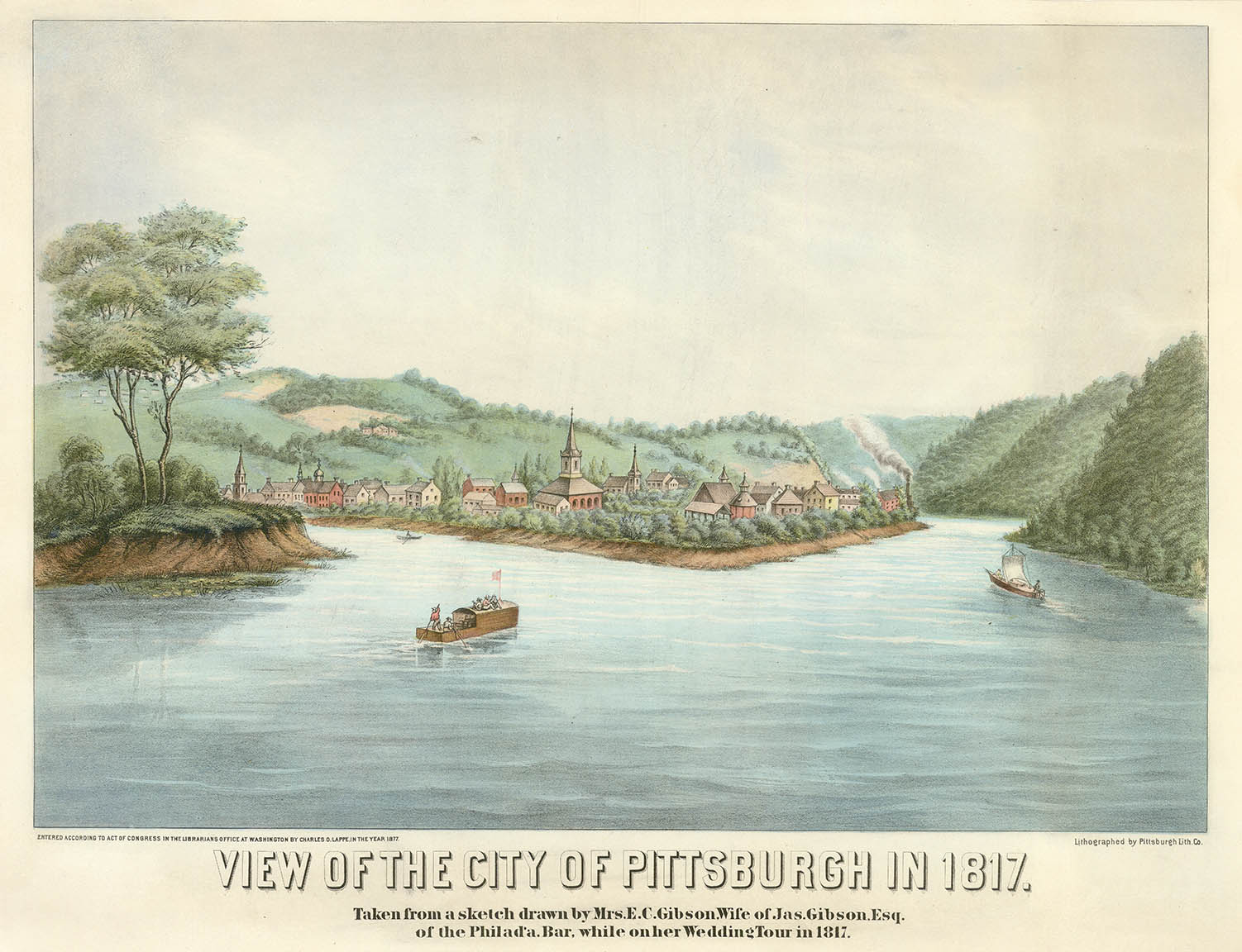DESCRIPTION: The title continues with: "Taken from a sketch drawn by Mrs. E.C. Gibson, wife of Jas. Gibson, Esq. of Philad'a Bar, while on her Wedding Tour in 1817. Lith. by Pittsburgh Lith. Co. A fine early view of the city.