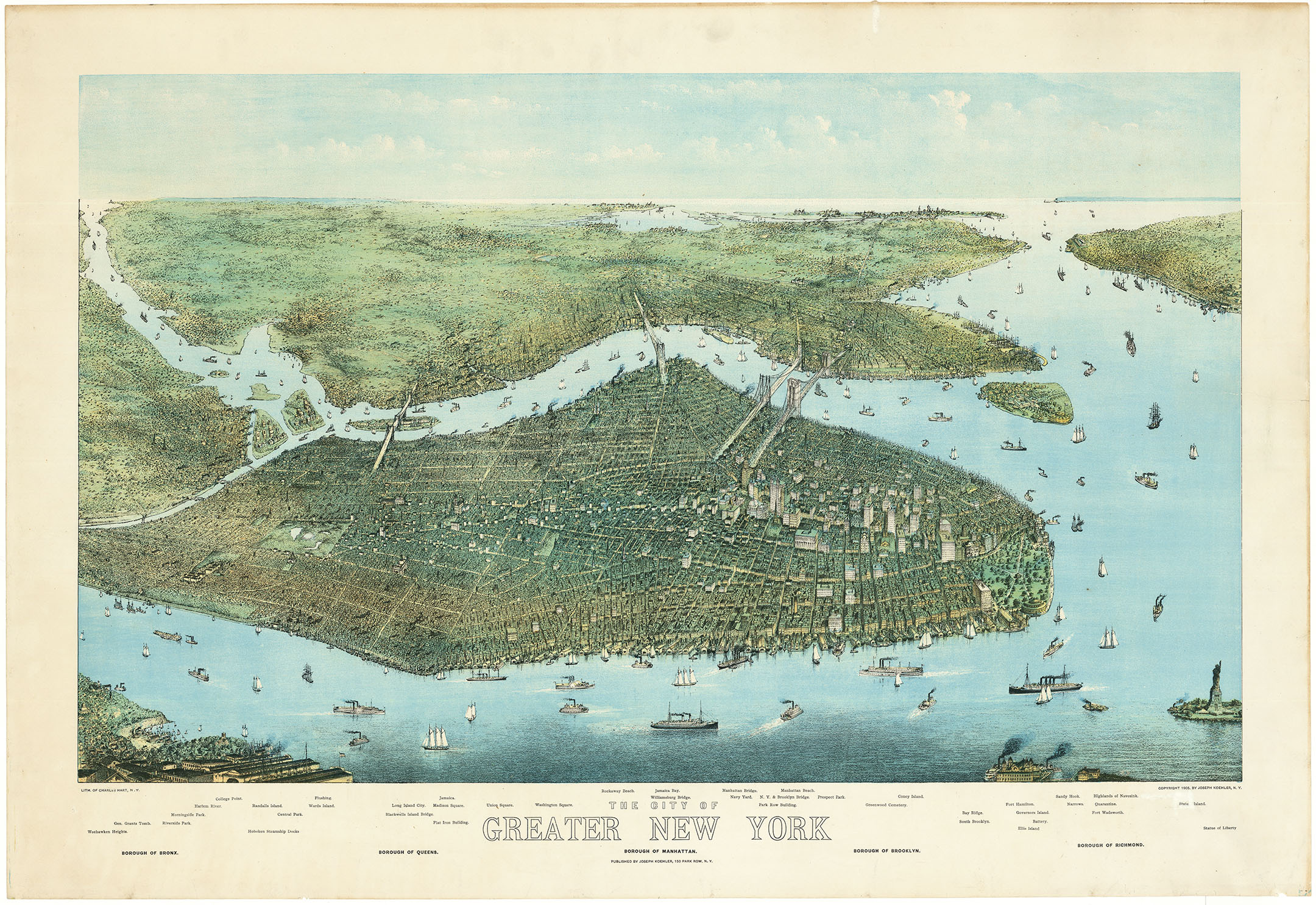 DESCRIPTION: Lith. of Charles Hart, N.Y.<br><br> Key identifies 48 locations, landmarks and places of interest. These include Grants Tomb, Riverside Park, Randalls Island, Blackwell's Island Bridge (now the Ed Koch bridge), Union and Washington Squares, Navy Yard, Prospect Park, Greenwood Centery, Cony Island, Bay Ridge, Fort Hamilton, Ellis Island, Sandy Hook, Fort Wadsworth and Statue of Liberty.