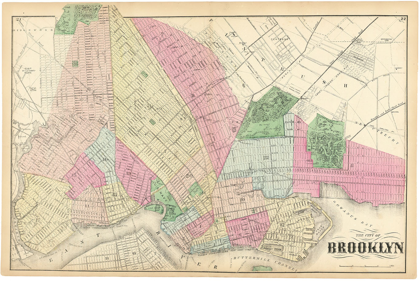 DESCRIPTION: "The City of Brooklyn," a vibrant map featured in the "Atlas of Long Island, New York. From recent and actual surveys and records," provides a detailed and colorful depiction of the area from Newtown Creek to Sunset Park. This map captures the intricate urban and architectural details of Brooklyn during its transformational phase in the late 19th century. As Brooklyn transitioned from a collection of small towns into a unified urban landscape, this map meticulously documented its streets, landmarks, and burgeoning neighborhoods, showcasing the region's evolution towards becoming an integral part of New York City. By detailing the precise layout of streets, parks, and significant buildings of the era, the map provides invaluable insights into the urban planning and community life of the time. It stands as both a crucial educational tool for those interested in urban development and a fascinating artifact for anyone eager to explore the historical layers that have shaped Brooklyn's unique character.