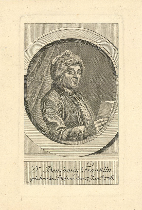 DESCRIPTION: Geobohrn zu Bofton den 17. Jan 1706.<br><br> Likely a lifetime German print.<br><br> Benjamin Franklin (1706-1790) is considered to be one of the greatest of all of our founding fathers. A highly intelligent man, over his lifetime he was an able scientist, a writer, printer and publisher. He was one of the most successful diplomats that the United States ever had. During the Revolutionary War, he acted as American Minister to France, successfully gaining French support for the American cause. He was also the only person who signed all four of the key documents in American history: The Declaration of Independence; The Treaty of Alliance with France; The Treaty of Peace with Great Britain; and The Constitution of the United States.