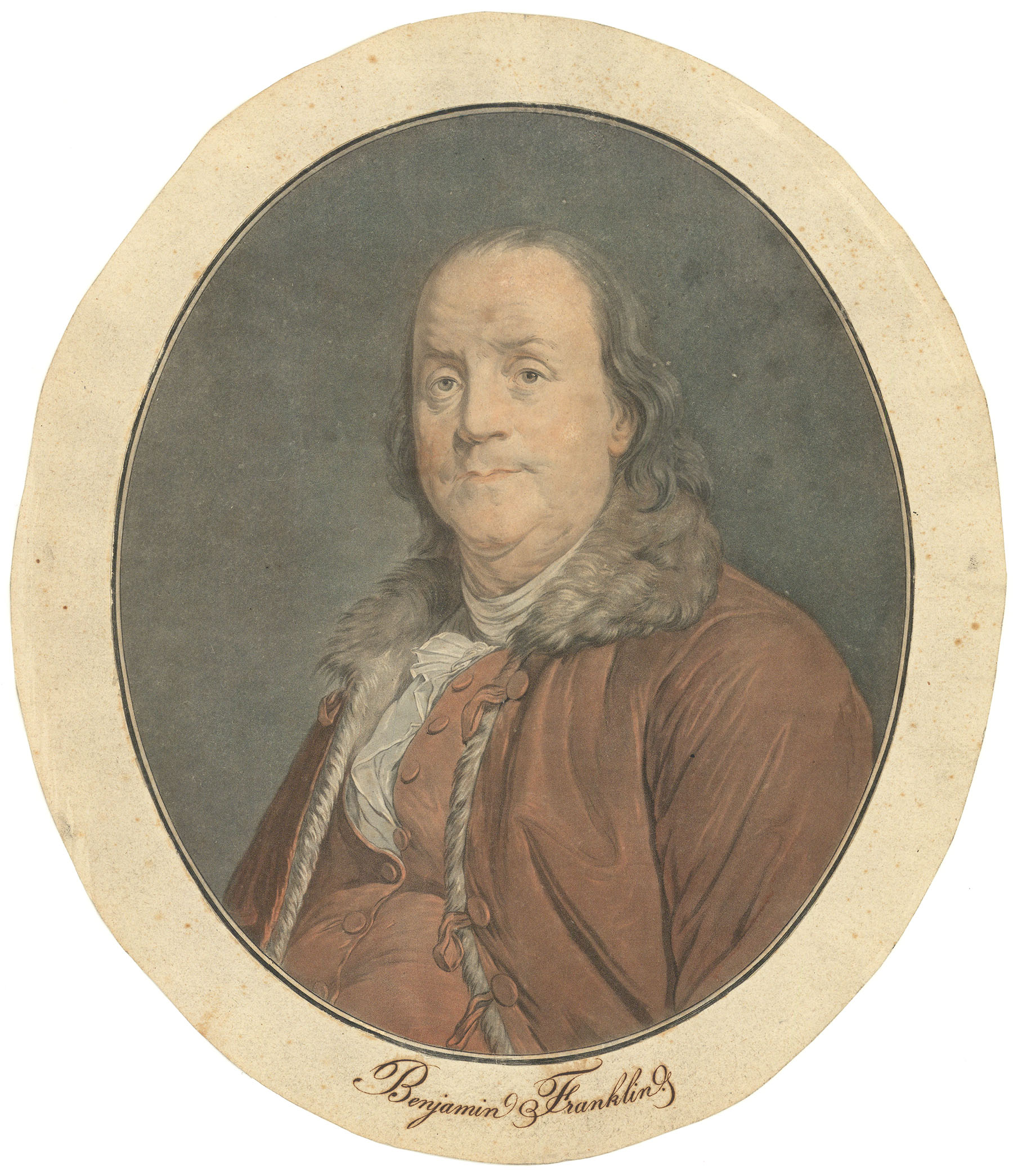 • DESCRIPTION: After Joseph Siffred Duplessis (French 1725–1802 Versailles). Engraved by Jean-Francois Janinet.<br><br> A rare separately portrait.<br><br> When Franklin arrived in France in December 1776 to negotiate aid for the American Revolutionary War, he was already a celebrity known for his simple dress and refusal to wear a wig. He stayed in a house provided by Jacques Donatien Le Ray de Chaumont, who commissioned a terracotta medallion with his profile as well as a portrait by Duplessis, which was exhibited at the Salon of 1779. It quickly became the most iconic image of this legendary statesman
