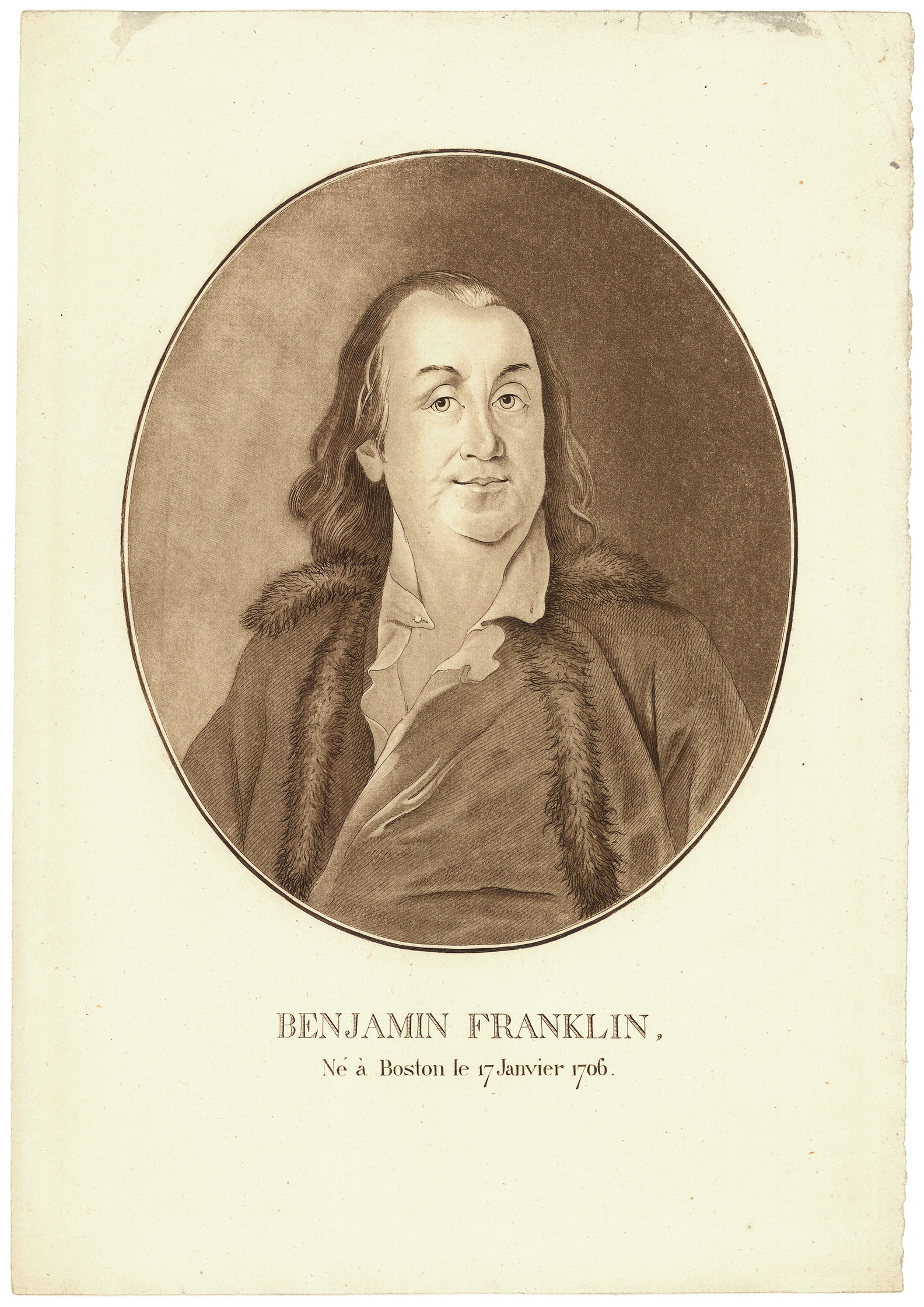 DESCRIPTION: No artist, engravers or publishers name given.<br><br> Based on the original painting by Anne-Rosalie Bocquet Filleul painted this portrait of Benjamin Franklin when the two were neighbors in Passy, just outside Paris. That artist and sitter knew each other socially is evident in this casual portrait. Wearing an open-necked shirt and a green, fur-lined dressing gown, Franklin reveals a friendly and slightly vulnerable side, despite his position then as US ambassador to France. Printed on Liad paper.