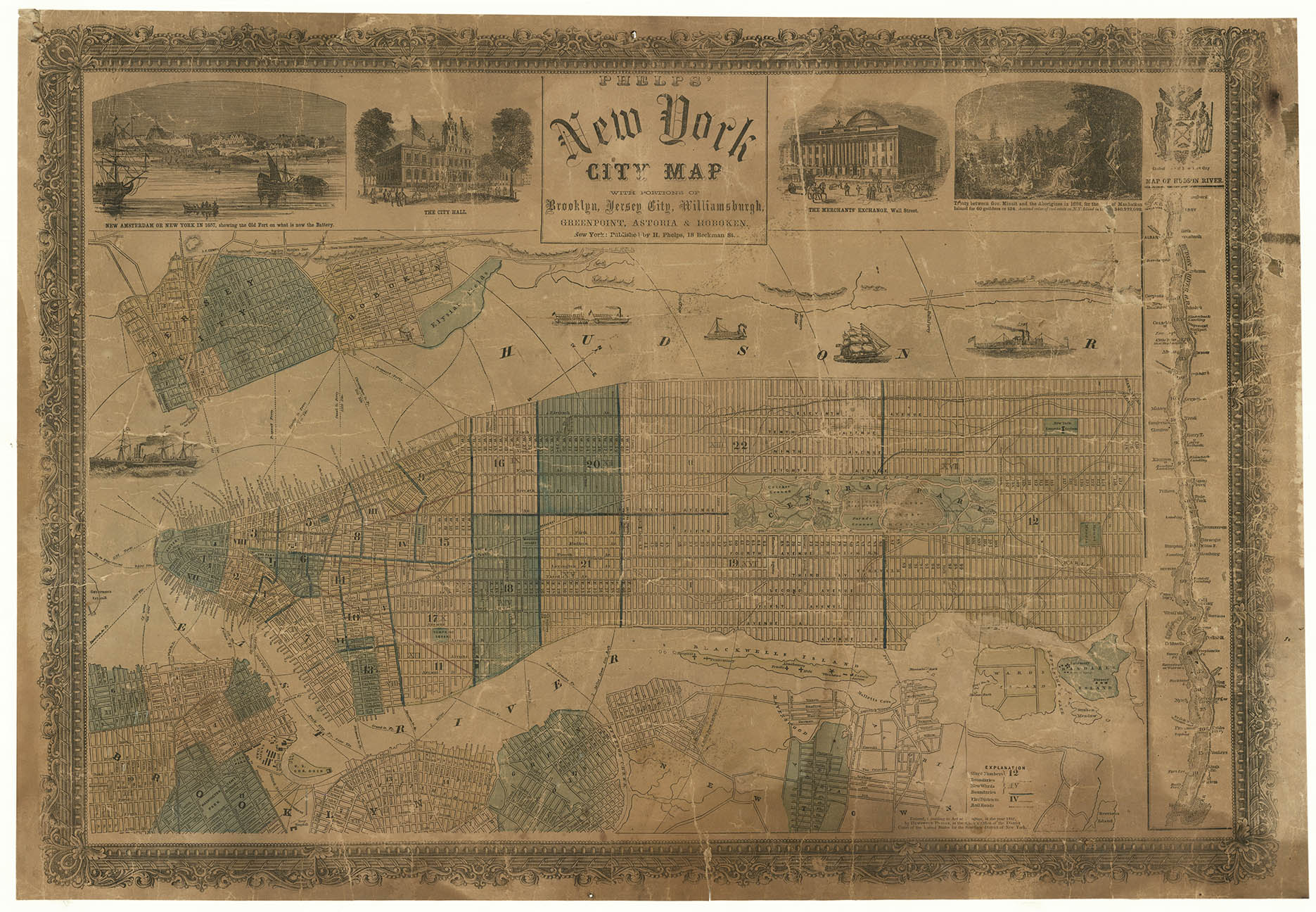 DESCRIPTION: A rare and unusual separately issued wall map.<br><br> This map largely based on his guide map of the city issued the same year. The differences being the title cartouche, the four views and a map of the Hudson River from NYC to Albany along the right edge. The Views are, left to right, New Amsterdam in 1867. City Hall, the Merchants Exchange, and an imaginary view of the treaty between Gov. Minuit and the natives of Manhattan in 1625.<br><br> Also shown is the newly delineated Central Park.<br><br> The whole of the map is framed within a beautifully engraved border.<br><br>