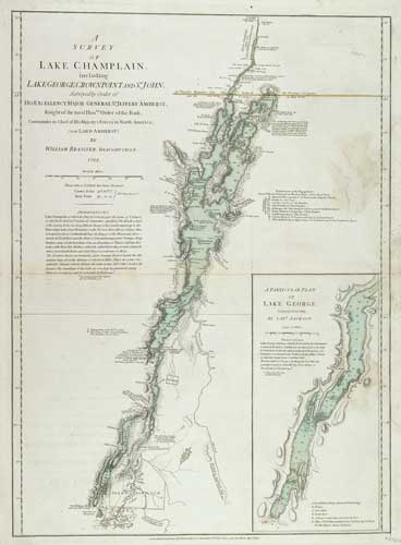 DESCRIPTION: A fine map showing the details of Lake Champlain taken from "The American Military Pocket Atlas." There is an inset in the lower right corner of "A Particular Plan of Lake George." Notes pertaining to observations and structures appear by both lakes. The Revolutionary War battle of Valcour Island is noted. This is the second state of the map, now showing the movement of the British and American fleets and the battle of Crown Point.