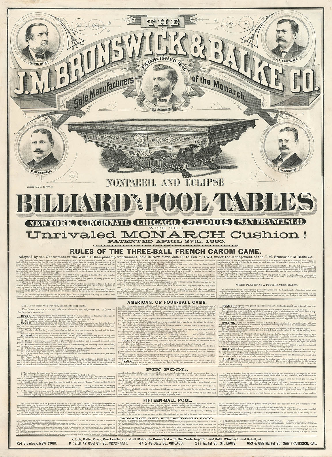 DESCRIPTION: A rare advertising broadside for the J.M. Brunswick & Blake Co. Builders of pool and billiard tables.<br><br> Pictured is a 1880 Monarch billiard table. Surrounding that are portraits of J.M. Brunswick, Julius Blake, A.T. Troescher, M. Bensinger and Leo. Schmidt. Below that they advertise there locations in New York, Cincinnati, Chicago, St. Louis and San Francisco. Following that are various rules.<br><br> Rules of the three-ball French Carom Game.<br><br> American, or four-ball game.<br><br> Pin Pool.<br><br> Fifteen-ball pool.<br><br> Monarch Red fifteen-ball pool.<br><br> This cataloger could not locate another impression of this broadside.