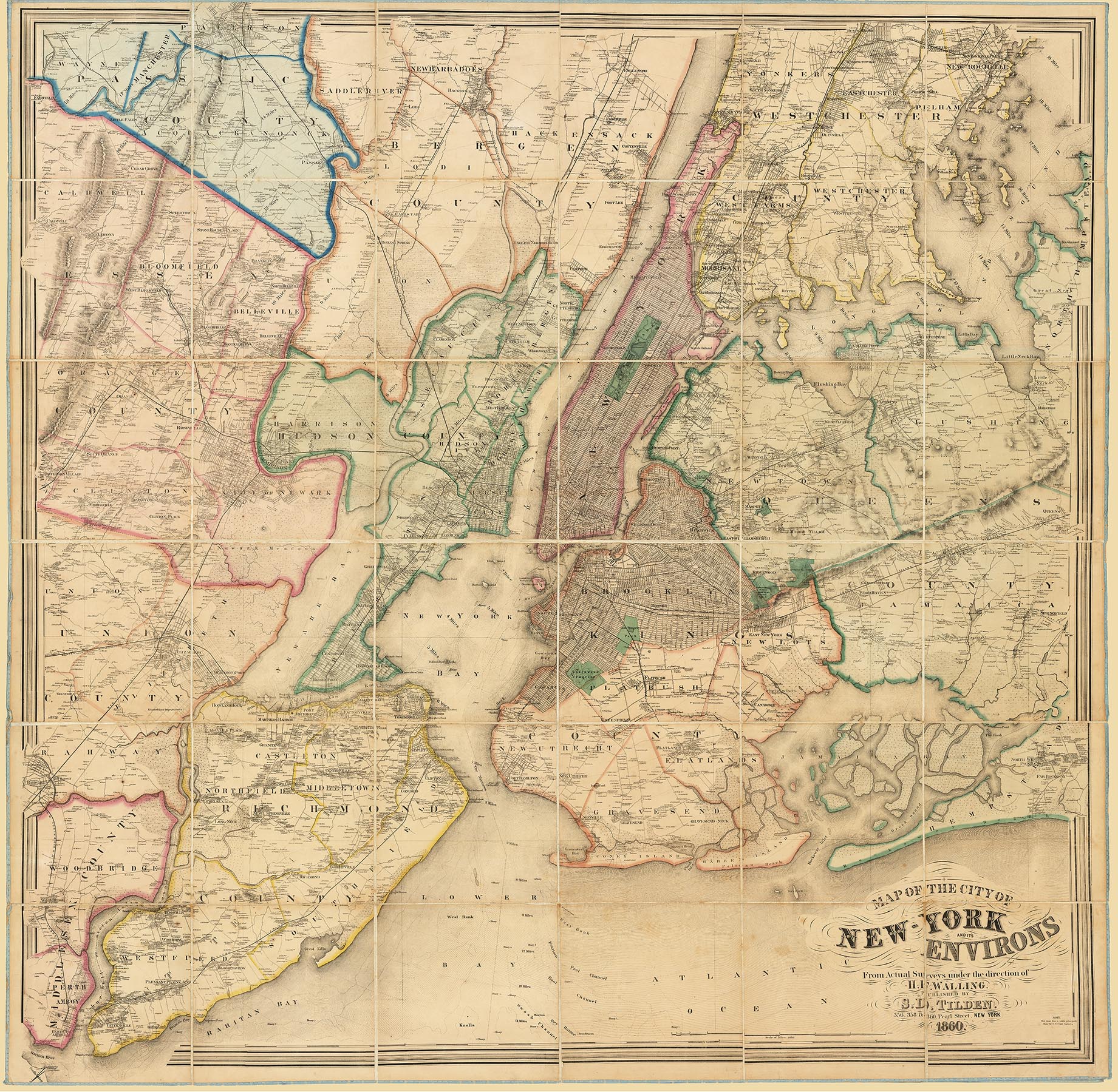 DESCRIPTION: A spectacular, information-rich, and very scarce 1860 map of the New York metropolitan area by Henry Francis Walling, one of the giants of 19th-century American mapmaking.<br><br> The map depicts a roughly 14-mile-square area centered on New York City Hall in Lower Manhattan. At the time New York City itself was confined to Manhattan Island, with a population just over 800,000. But the city was already an economic and cultural powerhouse, its growth fueled by the completion of the Erie Canal in 1825, the proliferation of rail lines, the completion of the Croton Aqueduct in 1848, and the arrival of tens of thousands of Irish immigrants. By choosing to place City Hall in the center of the map, Walling was emphasizing that the city already was in many ways the region’s beating heart, pumping people and goods on the great network of railroads running in and out of it in all directions. <br><br> Of course, New York City is not the only story here. The map shows that many of the same factors were driving development across the East River in Brooklyn, at the time America’s third-largest city, and across the Hudson in Hoboken, Jersey City and the other cities of Bergen County. Further afield, the railroad was bringing growth to smaller cities like those along the New York & New Haven line in Westchester County and the New Jersey Line in northeastern New Jersey. All the same, it’s striking to see just how much open space remained so close to the city, particularly in outlying areas of Kings and Queens Counties that today are densely populated. <br><br> Walling manages to cram an enormous amount of information into the map, though sometimes at the expense of legibility and with relatively little attention to the region’s natural topography (For instance, neither the rough terrain of Upper Manhattan or the long ridge of Brooklyn Heights are shown.) For Walling, as for us moderns, the real landscape of New York is the built landscape of streets, rail lines, piers, buildings, and homes. Even in the less densely populated areas, he takes advantage of the elbow room to identify by name thousands of residences; factories, mills, hotels, and other businesses; hospitals, churches,s and schools; cemeteries and parks; and even the several forts and batteries then considered vital to protect the Hudson River and its approaches.<br><br> Being a folding segmented case map, as opposed to a varnished roller map, the condition of this map is exceptionally good. The hand coloring is original and bright.<br><br>