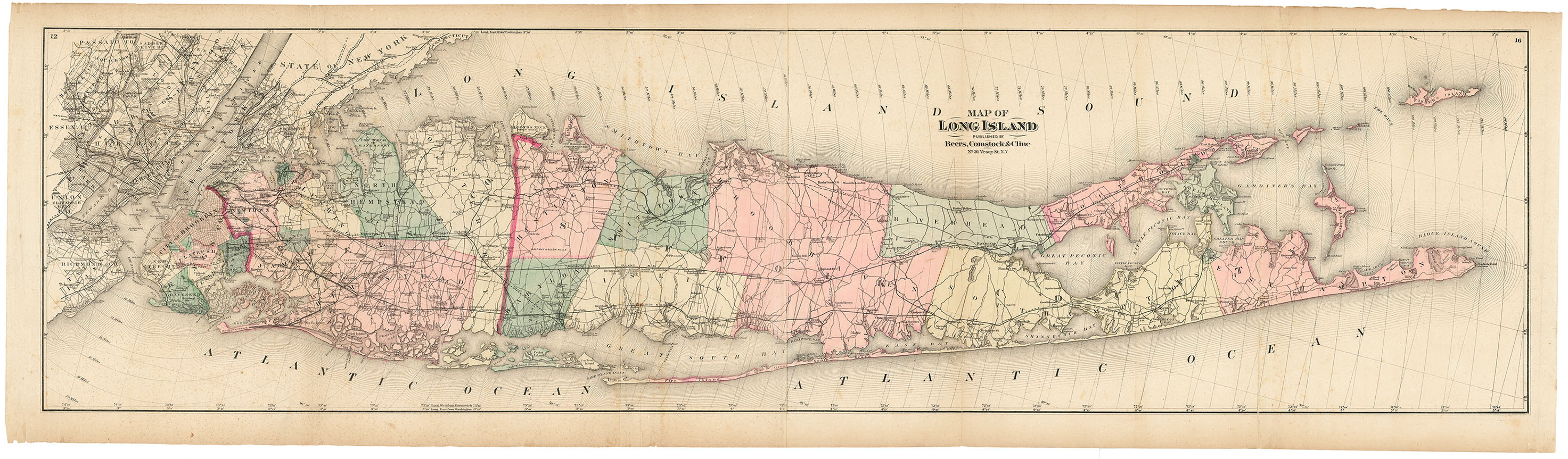 DESCRIPTION: The large fold out preface map from the "Atlas of Long Island, New York. From recent and actual surveys and records." It notes all the early roads and town names. Color coded for townships. The Long Island Rail Road shows the eastern terminiues as Greenport and Sag Harbor. This map is usually found in poor condition. A handsome map of the island.<br><br>