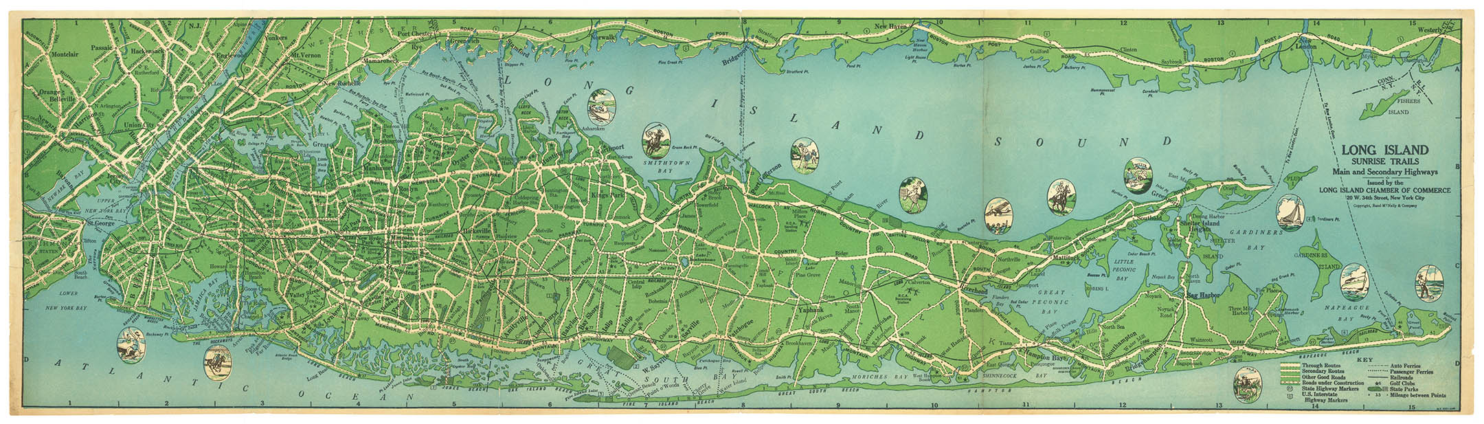 DESCRIPTION: This map shows the whole of Long Island, from Manhattan to Orient and Montauk Points. Including Fishers Island. Identifies all the major roads, long before the LIE. Numerous ferries to and from Connecticut are identified including some passenger ferries that long longer operate. They are: New Rochelle to Sea Cliff, Rye Beach to Sea Cliff, Greenwich to Bayville, Stamford to Oyster Bay, and New London to Ford Pond Bay. Small oval vignettes depict various activities, including steeple chase, polo, canoeing, tennis, sailing, and surf fishing.