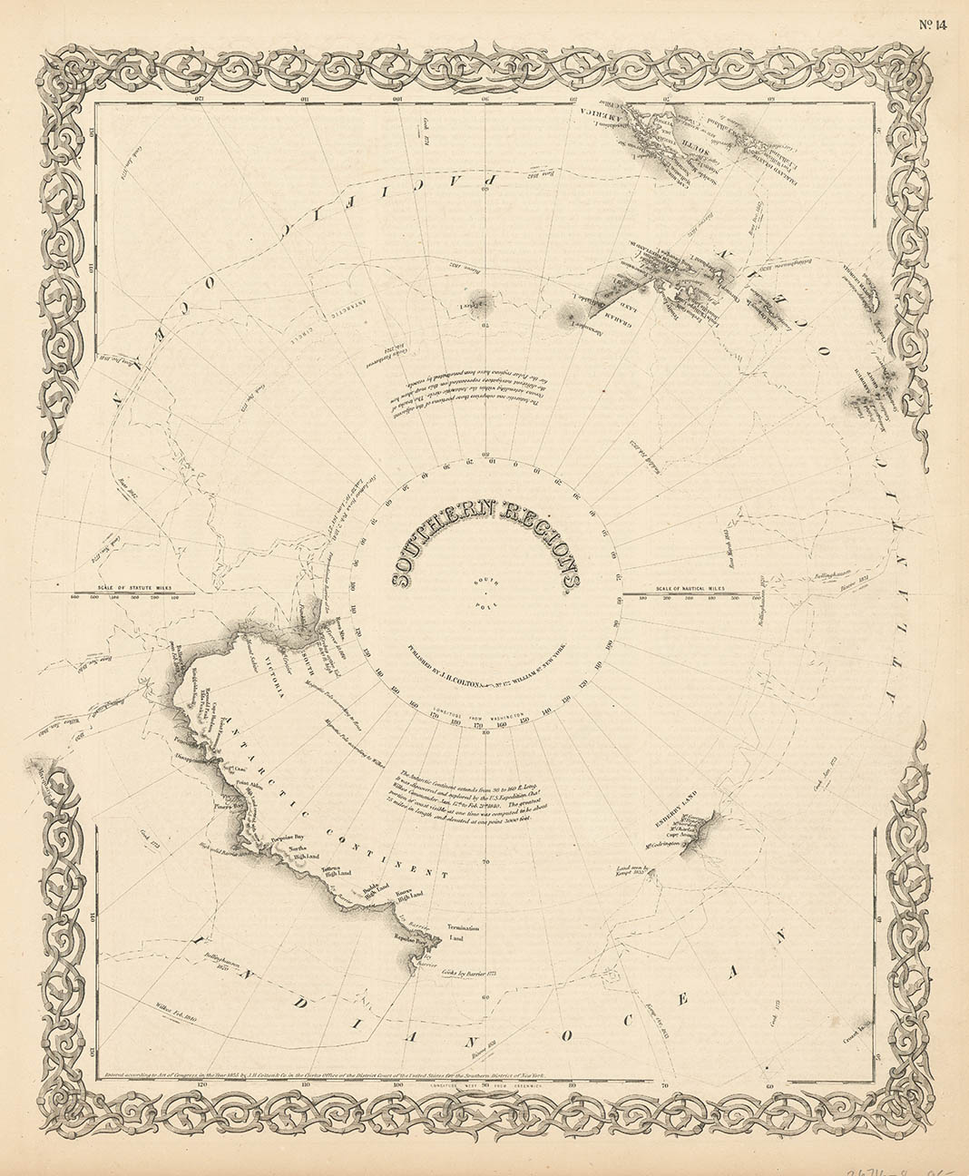 DESCRIPTION: A decorative and well engraved map from "Colton's Atlas of the World." This map gives the known coast line of the Antarctic continent. Noted are the tracts of Cook, WilkesRoss, Bellinghausen, Weddel and Biscoe. The tip of South America and the Fakland islands can be seen in the upper right.