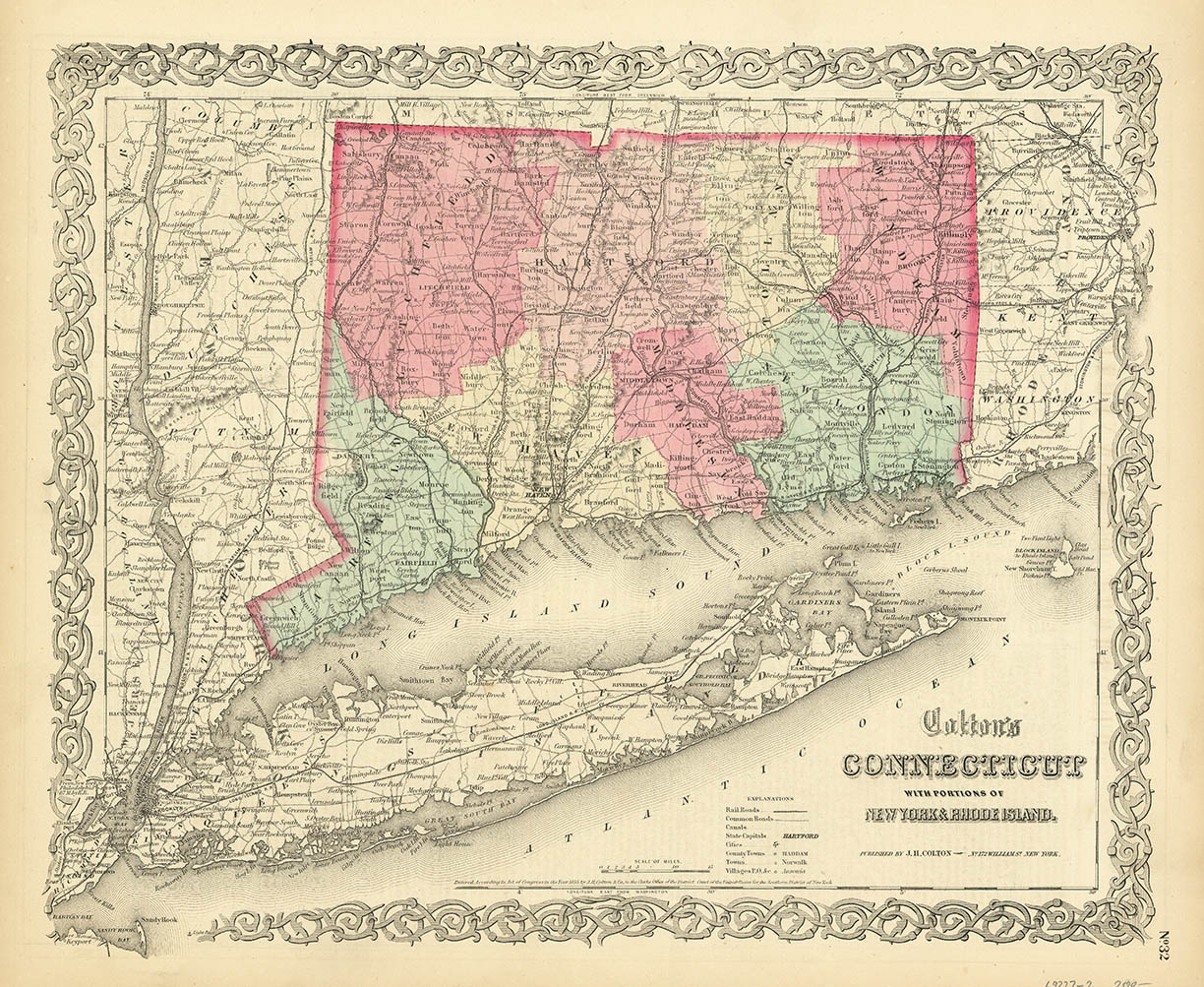 DESCRIPTION: A decorative and well engraved map from "Colton's General Atlas." Long Island is nicely displayed as well. The map identifies counties, towns, roads, railroads and topographical features.