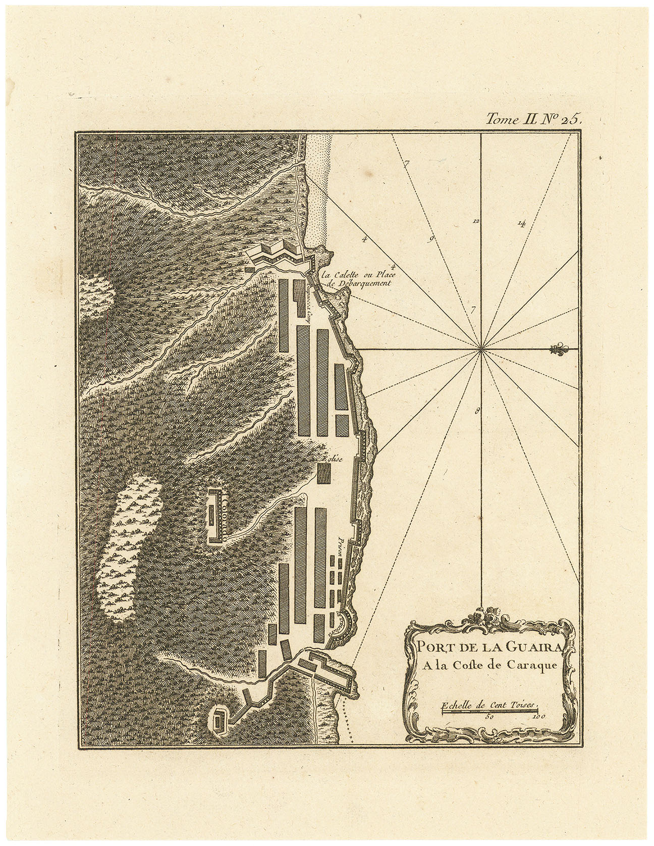 DESCRIPTION: Map of the port of La Guaira in Venezuela. This map appeared in Bellin's "Le Petit Atlas Maritime, ou Recueil de Cartes et de Plans des Quatre Parties du Monde". This atlas or pilot is a wonderful French-produced small-sized work that depicted a great many parts of the known world..<br><br> The cartographer Jacques Nicolas Bellin (1703-1772) was one of the most important and proficient French cartographers of the eighteenth century. He was appointed the first Ingenieur Hydrographe de la Marine, and also the Official Hydrographer to the French.