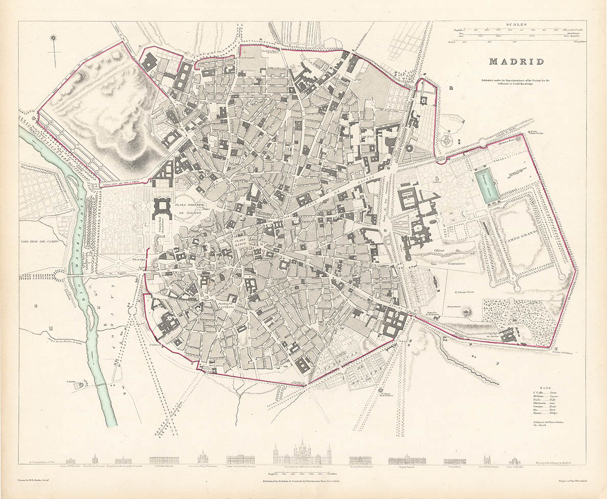 DESCRIPTION: A detailed city plan adorned with 12 profile views of buildings below.The Society for the Diffusion of Useful Knowledge, better known as SDUK, was an English enterprise devoted to spreading the most up to date cartographic information and enhancing geographical understanding and knowledge of the world. Over a period of years, the maps that the SDUK produced were issued by various publishers. The following is a breakdown. Baldwin & Craddock, 1829-32. Chapman & Hall, 1844. C. Knight, 1844-52. G. Cox, 1852-3. Stanford, 1857-70. The maps from this series are known for their fine engraving and attention to detail.